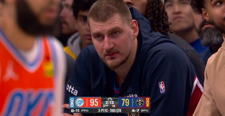 威海期货配资 很无奈!约基奇在场下坐着满面愁容 球队三节不到已落后雷霆16分