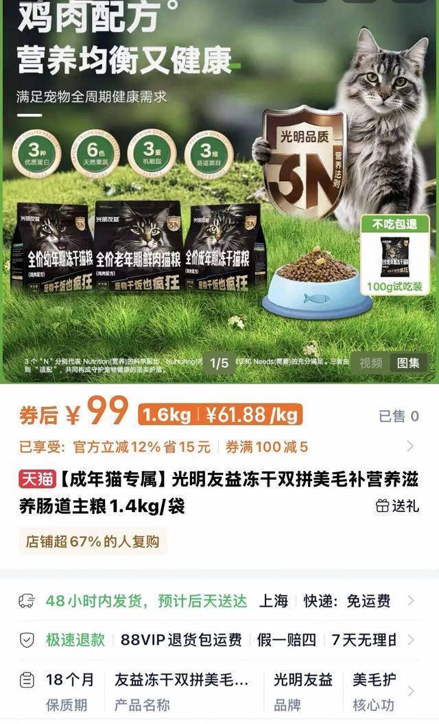 最绝的是光明这次直接剑指高端市场,新品牌“光明友益”推出的四款狗粮全是无谷冻干、鲜肉配方,每公斤售价70块,还搞了100克的试吃装。这算盘打得啪啪响:既利用了自己现成的乳制品供应链和品控体系,又抓住了现在铲屎官“把狗当孩子养”的心态。有网友扒出配料表,发现居然用了三重动物蛋白和后生元配方,比自己吃的外卖还讲究。难怪有人酸:“我家狗吃的比我好系列又添实锤!”